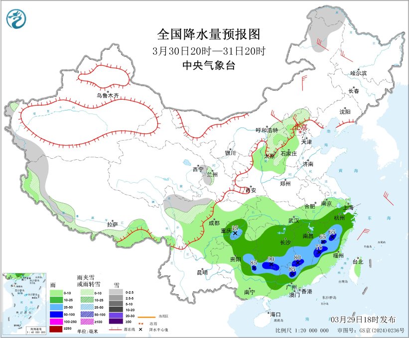 图1 全国强降雨落区预报图(3月29日20时-30日20时)