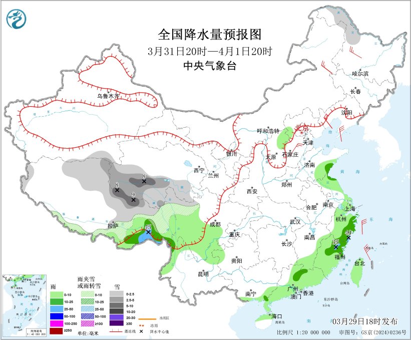 图2 全国降水量预报图(3月29日20时-30日20时)