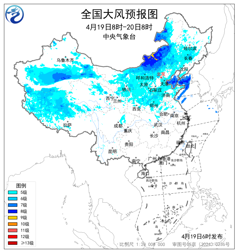 4月19日08时至20日08时,内蒙古东北部、黑龙江西北部、新疆南疆西部山区和沿天山地区西段、青海南部和东北部等地部分地区有小到中雪或雨夹雪,其中,内蒙古东北部、黑龙江西北部、新疆南疆西部山区等地部分地区有大到暴雪(10~12毫米);黑龙江西北部、河北南部、山东西部、四川东部、重庆、贵州、云南东部、湖南西部、广西大部等地部分地区有中到大雨,其中,重庆东南部、贵州北部、广西北部等地部分地区有暴雨(50~80毫米)。新疆东部和南疆盆地、内蒙古大部、山西、河北大部、北京西部和北部、天津、山东西部和北部、河南中北部、黑龙江西部和南部、吉林中西部、辽宁中西部、宁夏、陕西中北部、甘肃北部、青海北部、西藏中西部等地部分地区有5~7级风,阵风8~9级,其中新疆东部山口地区和南疆盆地东部、内蒙古中部、河北南部、河南中北部局地有8~9级风,阵风10级以上;渤海、渤海海峡、黄海北部海域、黄海中西部和西南部海域将有7~8级、阵风9级的大风(见图5)。
