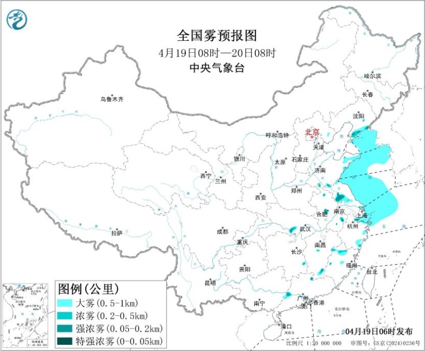 预计,19日白天,黄海北部和中部海域、辽东半岛东部沿岸海域、山东半岛南部沿岸海域、成山头附近海域、大连港、青岛港将有能见度不足1公里的大雾,19日白天至夜间,黄海南部海域、东海西北部海域、江苏东部沿岸海域、长江口及杭州湾附近海域将有能见度不足1公里的大雾。此外,19日早晨至上午,辽宁东南部、山东东部、江苏中北部、安徽中部、浙江东部、湖北中部、福建北部等地的部分地区有大雾,局地有能见度不足200米的强浓雾(见图4)。中央气象台4月19日06时继续发布大雾黄色预警。