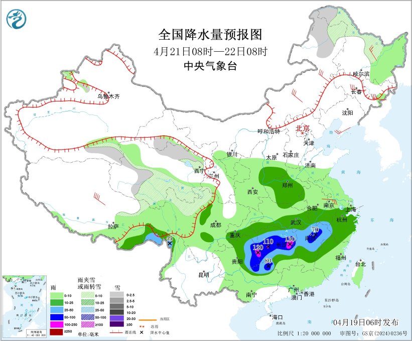 4月20日08时至21日08时,内蒙古东北部、黑龙江西北部、新疆沿天山地区西段和南疆南部山区、西藏北部和东北部、青海中部和东部等地部分地区有小到中雪或雨夹雪,其中,内蒙古东北部、黑龙江西北部、新疆沿天山地区西段等地部分地区有大到暴雪(10~14毫米);江汉东部、江南中西部、四川东北部、贵州东部和南部、华南北部、西藏东南部等地部分地区有中到大雨,其中,湖南南部、广西北部等地部分地区有暴雨或大暴雨(100~130毫米)。新疆东部、甘肃北部、青海中西部、内蒙古中东部、黑龙江西部和南部、吉林、辽宁中西部、山西北部、河北北部、山东东部、江苏东部以及西藏中西部等地部分地区有5~7级风,阵风8~9级,其中内蒙古中部等地部分地区有8~9级风,阵风10级以上;渤海、黄海大部海域将有7级、阵风8级的风(见图6)。