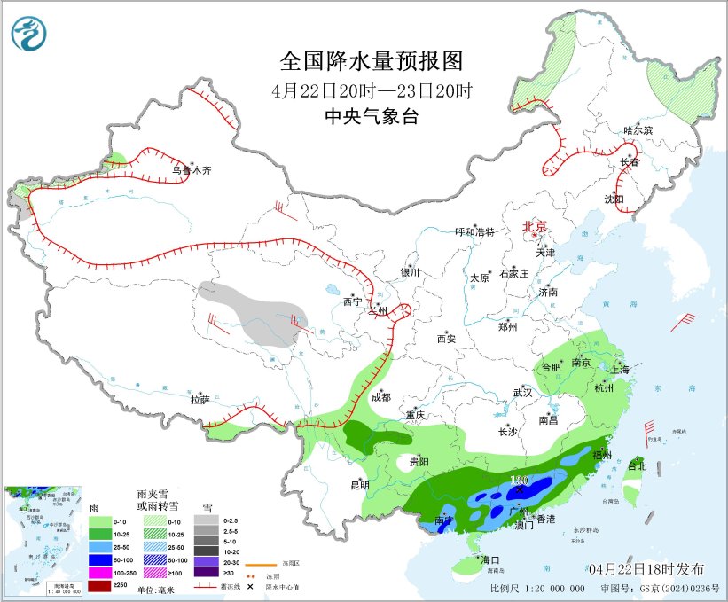 预计,4月22日20时至23日20时,广西东部和南部、广东中北部和西部、福建南部等地部分地区有大到暴雨,其中,广东中部局地有大暴雨(100~130毫米);上述部分地区伴有短时强降水(最大小时降雨量20~40毫米,局地可超过50毫米),局地有雷暴大风或冰雹等强对流天气。中央气象台4月22日18时继续发布暴雨蓝色预警。