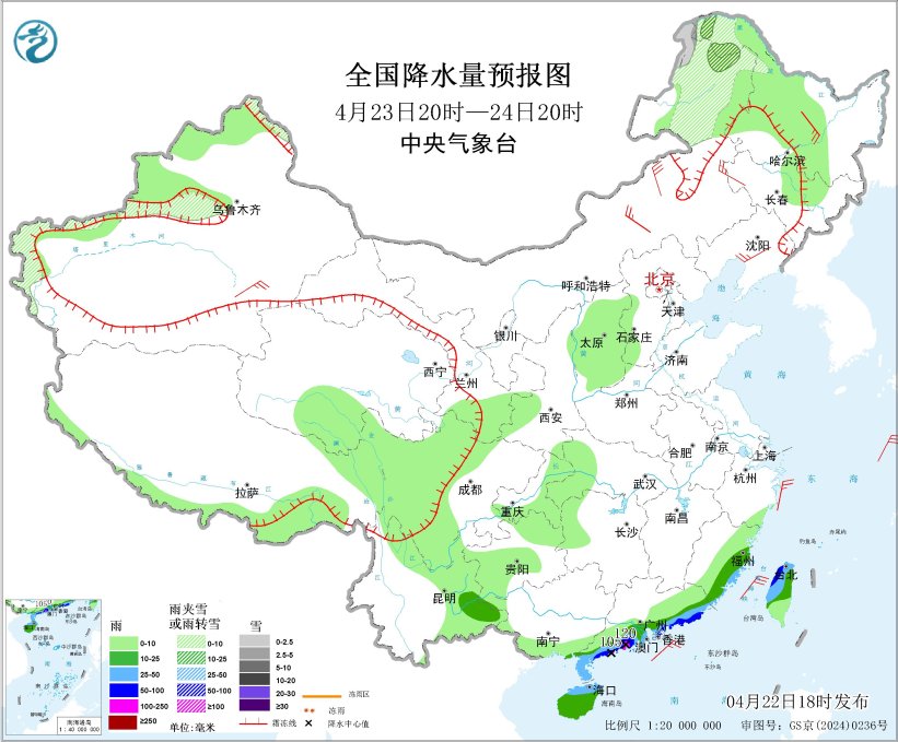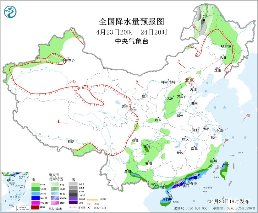 4月23日20时至24日20时,福建东南部、广东南部、海南岛、台湾岛等地有中到大雨,广东南部沿海局地暴雨或大暴雨(100~120毫米);内蒙古东北部、黑龙江西北部、新疆北部和西部等地有小雨(雪)或雨夹雪,局地中雨(雪)。内蒙古东北部、东北地区等地有4~6级风。东海北部海域、台湾海峡将有5~6级、阵风7级的东北风(见图3)。