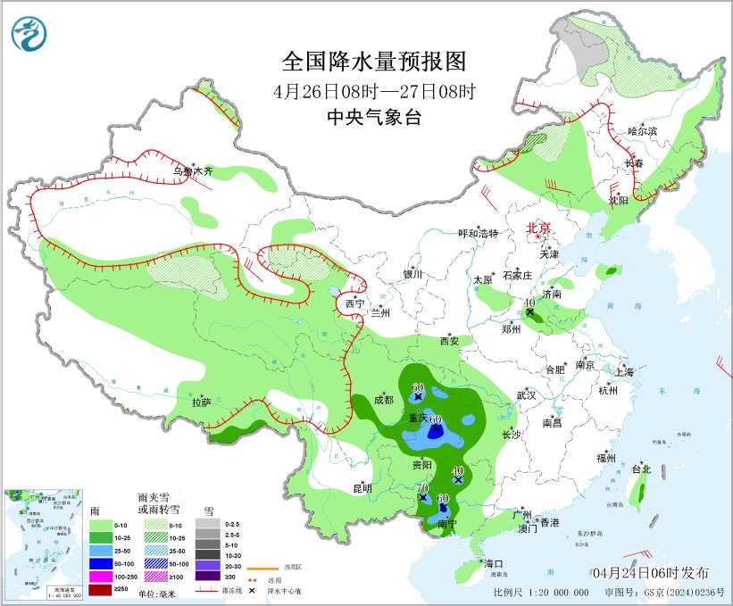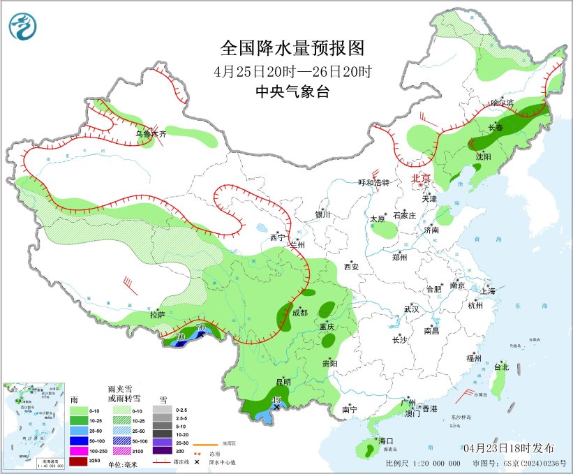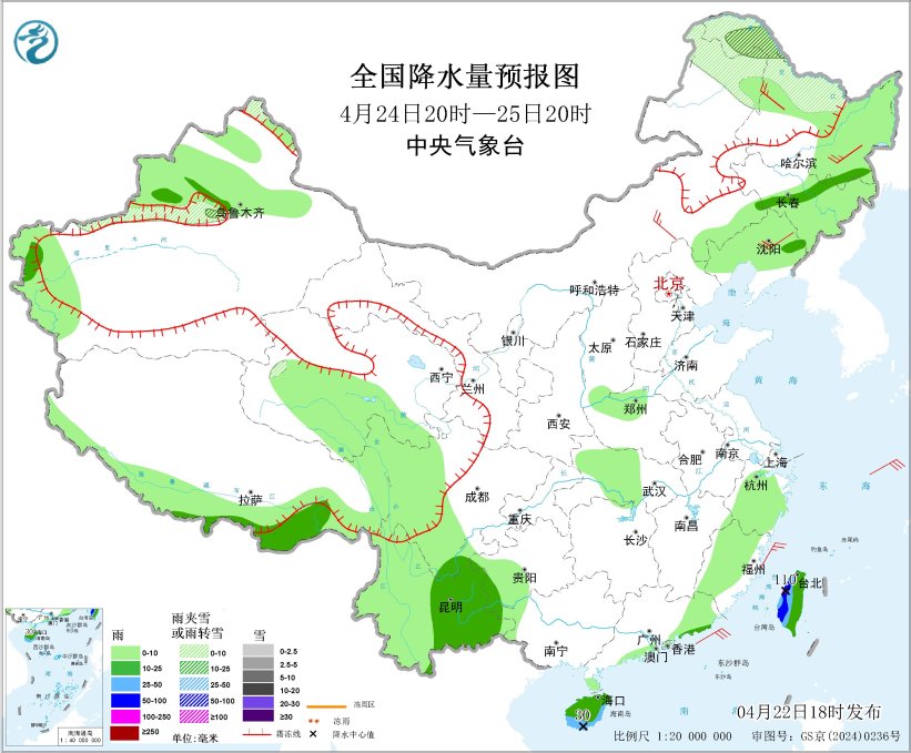 图4 全国降水量预报图(4月24日20时-25日20时)