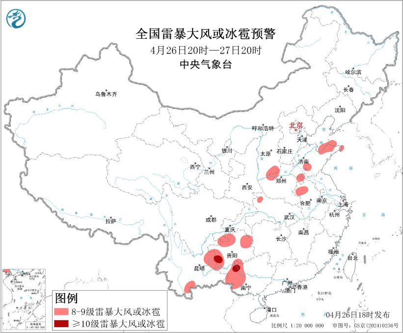 26日夜间至29日,西南地区东部、江汉、江南、华南等地部分地区将自西向东出现大到暴雨,局地大暴雨,并伴有短时强降水、雷暴大风或冰雹等强对流天气,主要降水时段为27日至28日。预计4月26日20时至27日20时,黄淮、江淮西北部、西南地区东部、华南西部等地的部分地区将有8级以上雷暴大风或冰雹天气,其中,贵州西南部、广西西北部等地的部分地区将有10级以上雷暴大风,最大风力可达11级以上(见图1);黄淮西南部、西南地区东部、江南西部、华南西部等地的部分地区将有小时雨量大于20毫米的短时强降水天气,其中,广西西南部和东北部等地的部分地区小时雨量大于50毫米,最大可达60毫米以上(见图2)。中央气象台4月26日18时发布强对流天气蓝色预警。