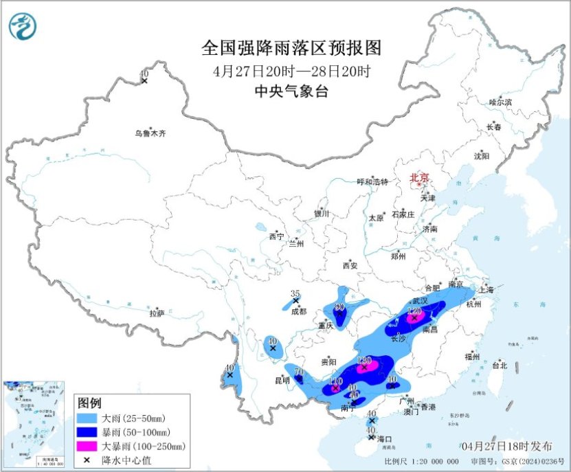 4月27日20时至28日20时,江淮西南部、江汉东南部、江南北部和西部、西南地区大部、华南西北部等地部分地区有中到大雨,其中,安徽南部、湖北东南部、江西西北部、湖南中南部、贵州东南部、广西东北部等地部分地区有暴雨或大暴雨(100~135毫米)。内蒙古大部、辽东半岛、山东半岛、苏皖南部、新疆大部、青藏高原等地部分地区有4~6级风。渤海、黄海大部海域、北部湾将有5~6级大风、阵风7级(见图5)。