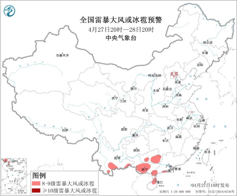 27日夜间至29日,西南地区东部、江南、华南等地部分地区有大到暴雨,局地大暴雨,并伴有短时强降水、雷暴大风或冰雹等强对流天气。预计,4月27日20时至28日20时,四川东部和南部、重庆大部、云南西部和东部、贵州南部、江南北部和西部、华南西部、海南岛北部等地部分地区有大到暴雨,其中,湖北东南部、江西西北部、广西北部和西部等地部分地区有大暴雨(100~130毫米)。上述部分地区伴有短时强降水(最大小时降雨量20~50毫米,局地可超过60毫米)(见图1)。华南中西部、西南地区南部等地的部分地区将有8级以上雷暴大风或冰雹天气(见图2)。中央气象台4月27日18时发布暴雨黄色预警和继续发布强对流天气蓝色预警。