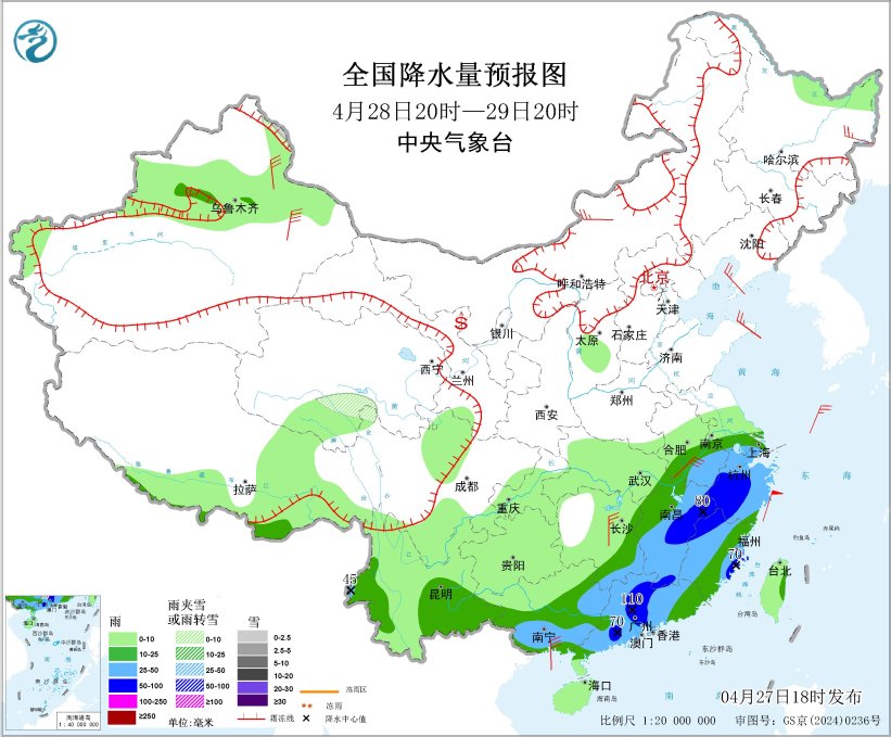 图5 全国降水量预报图(4月27日20时-28日20时)