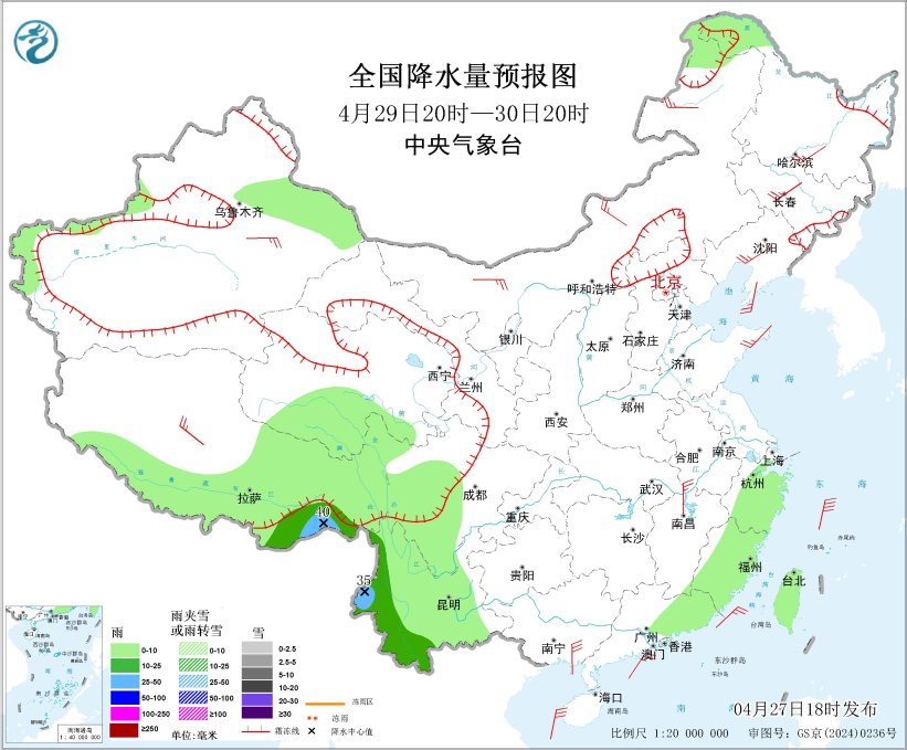 图6 全国降水量预报图(4月28日20时-29日20时)