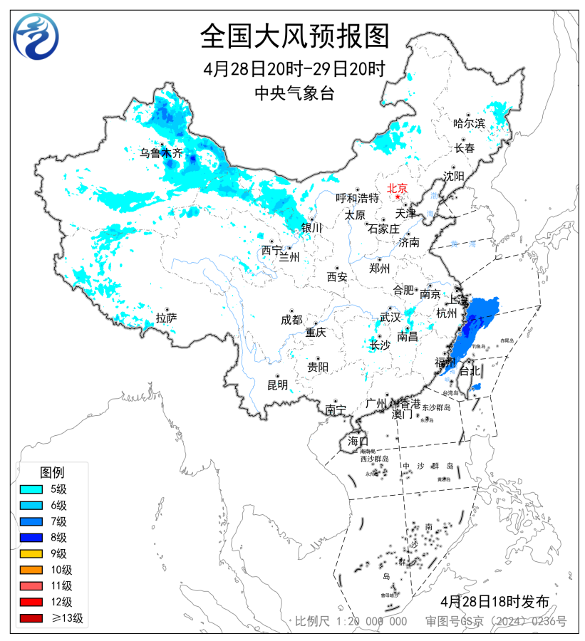 4月28日20时至29日20时,江南大部、华南大部、云南西部等地部分地区有中到大雨,其中,江西东北部、浙江西南部、福建东南部和西北部、广东中西部等地部分地区有暴雨或大暴雨(100~110毫米);内蒙古中部、黑龙江东部、辽东半岛、山东半岛、安徽中部、湖南中部、新疆北疆东部等地部分地区有4~6级风,其中,新疆东部部分地区有6~7级风;东海西部海域将有7~8级大风、阵风9~10级;东海东部海域、台湾海峡将有6~7级大风、阵风8级(见图4)。