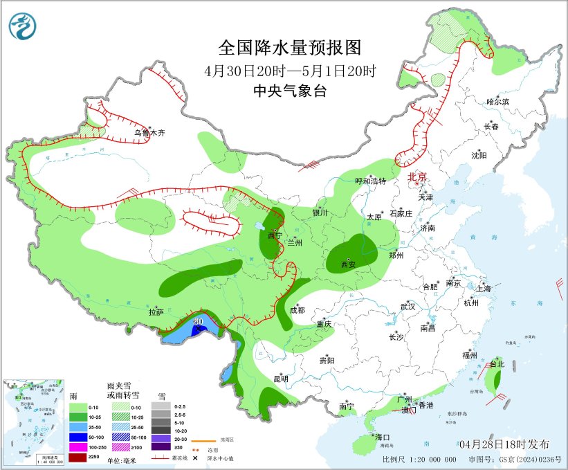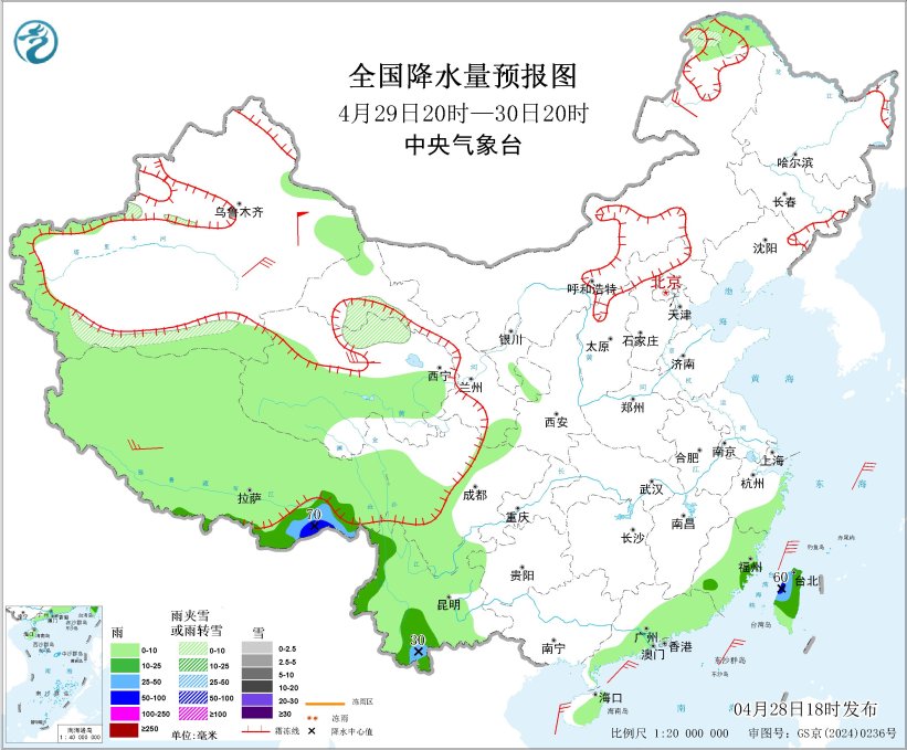 图5 全国降水量预报图(4月29日20时-30日20时)