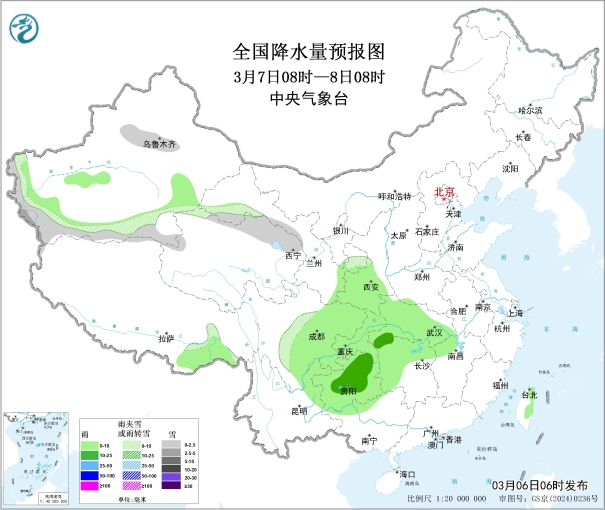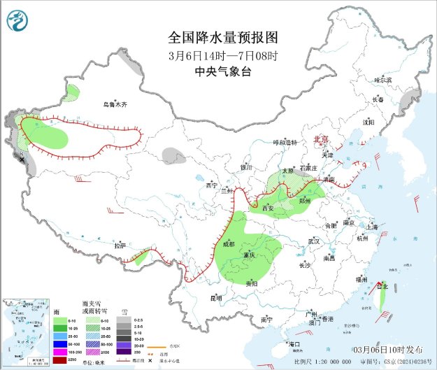 图1 全国降水量预报图(3月6日14时-7日08时)