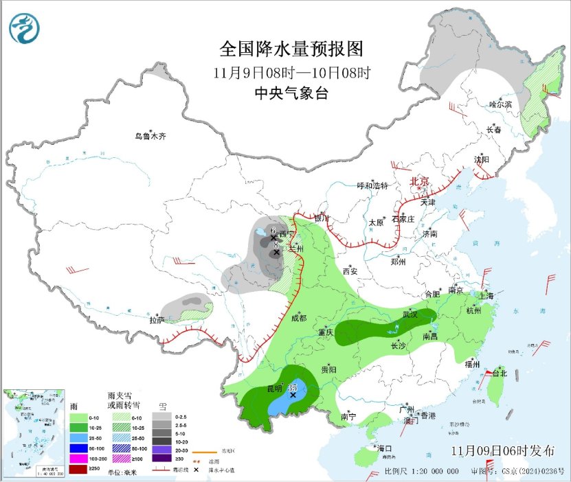 昨日,青海东南部、甘肃南部、河北北部、内蒙古东北部、吉林东部、黑龙江等地出现小到中雪或雨夹雪,局地大雪;云南东北部、贵州北部、湖南北部、江西中部等地出现大雨,局地暴雨。预计今天,内蒙古东北部、黑龙江北部和东部、西藏东北部、青海东部、甘肃南部、川西高原北部等地有小到中雪或雨夹雪, 局地大雪(5~8毫米);湖北东部、湖南北部、江西北部、重庆东南部、贵州北部和南部、云南中东部等地有中雨,云南东南部有大雨(25~35毫米)。