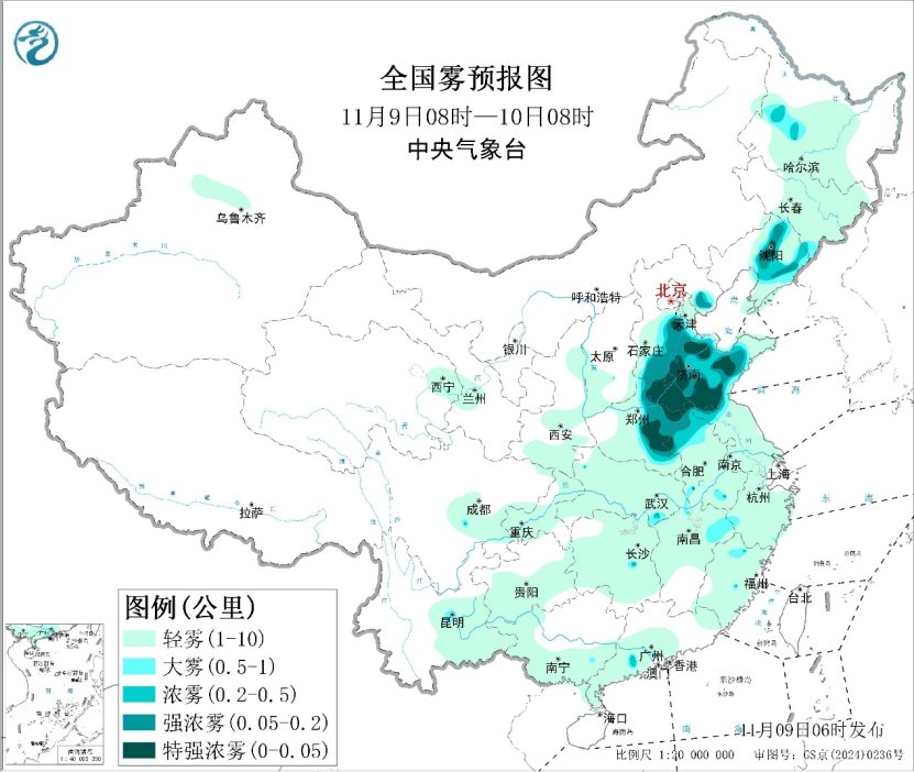 华北南部、黄淮等地公众还需关注大雾天气导致的能见度较差对交通出行的不利影响。今晨至上午,河北南部、山东中西部、河南东部、辽宁中部等地的部分地区有能见度不足200米的强浓雾,局地有能见度不足50米的特强浓雾。中央气象台已升级发布大雾橙色预警。9日午后起,受冷空气影响,上述地区的大雾天气将逐渐减弱消散。